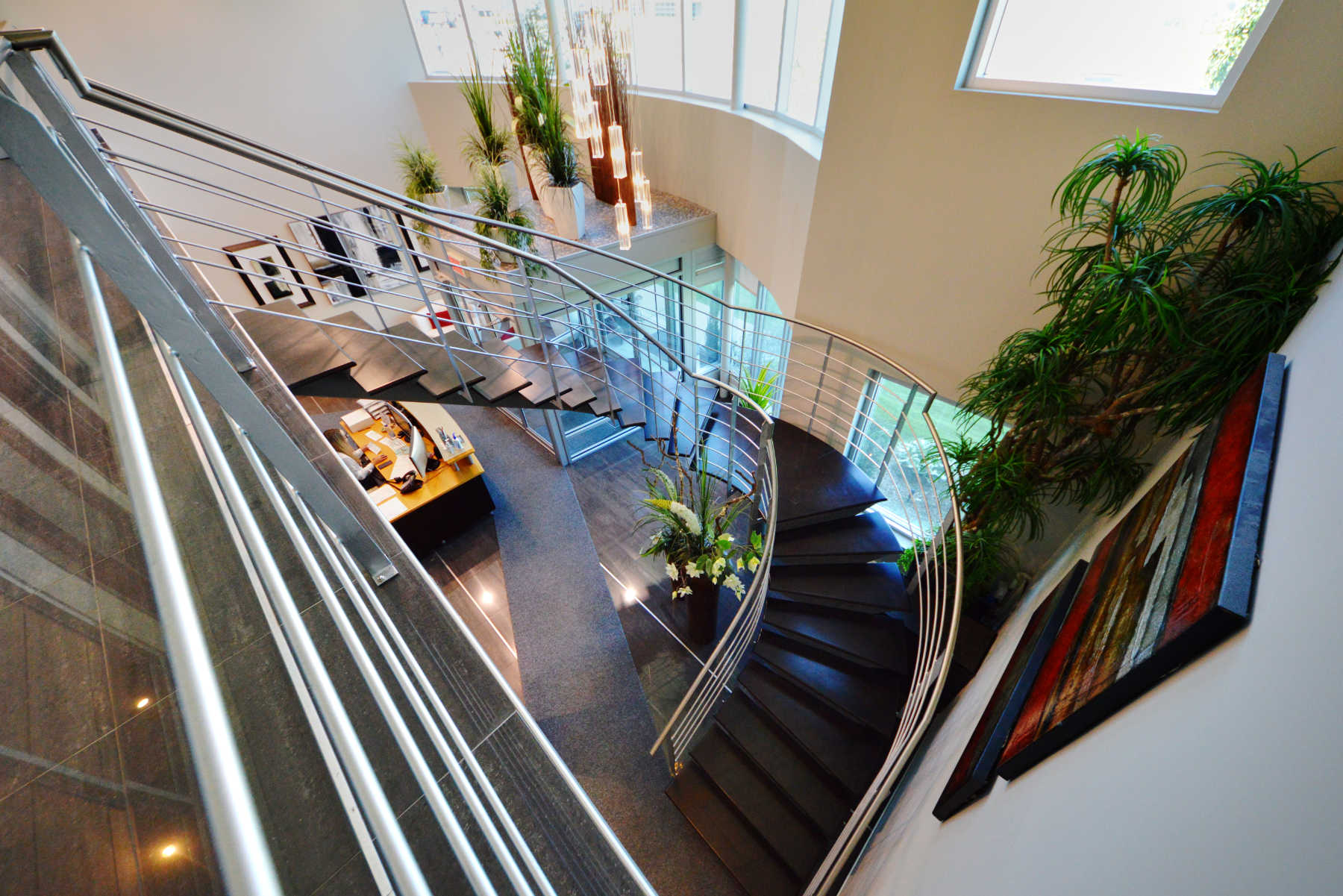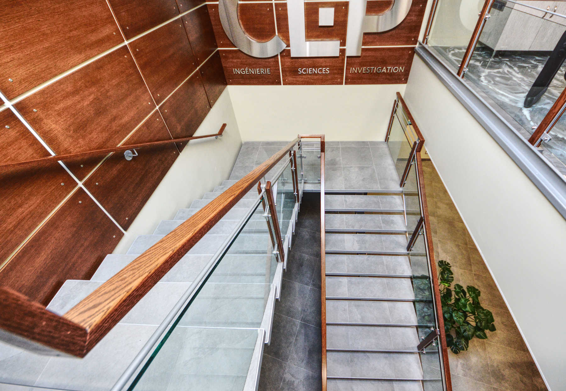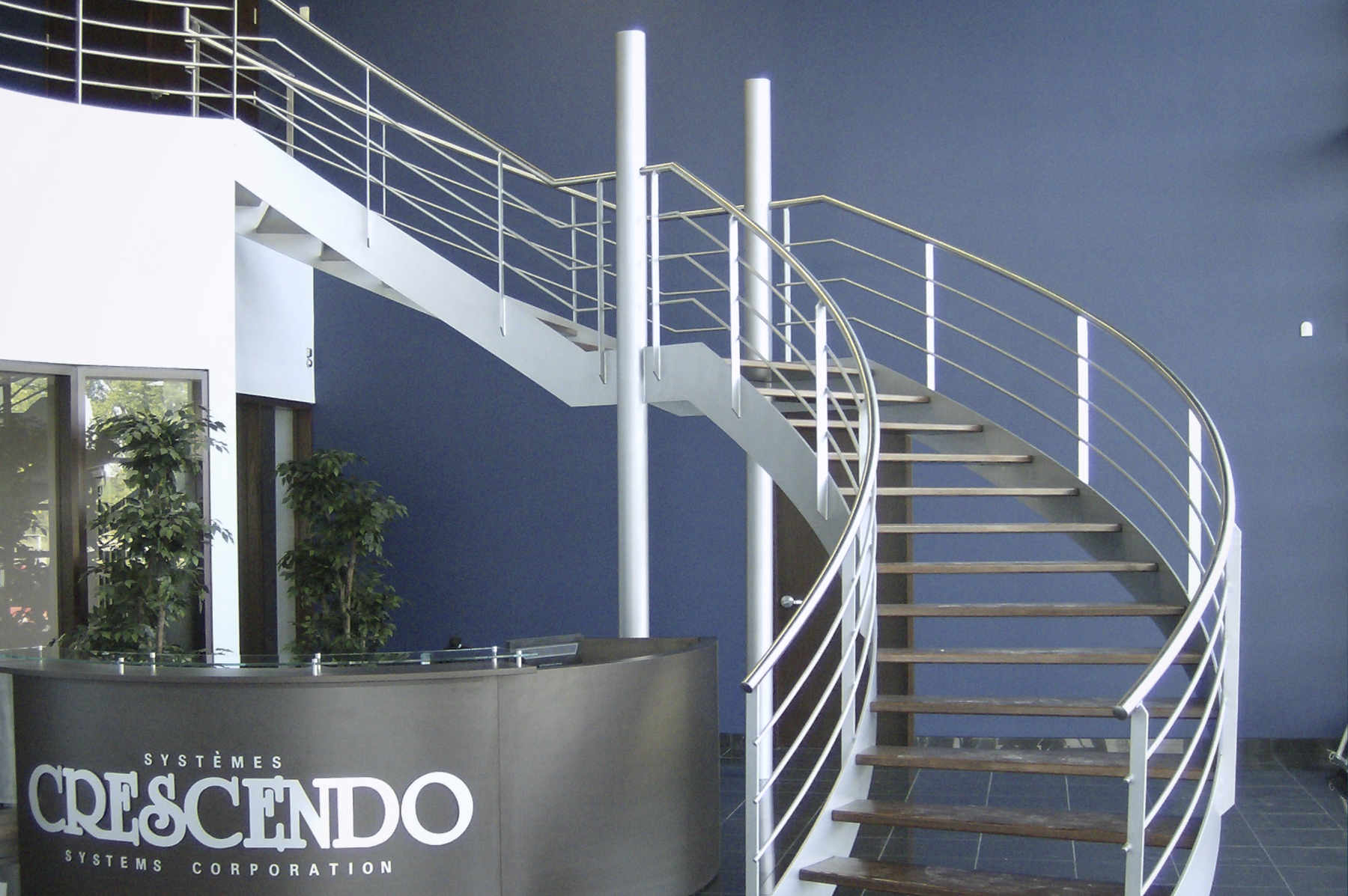 Garde-corps des escaliers de secours d’un édifice 18 étages avec vue sur le pont Jacques-Cartier; fabrication et installation d’un escalier monumental à l’entrée principale.