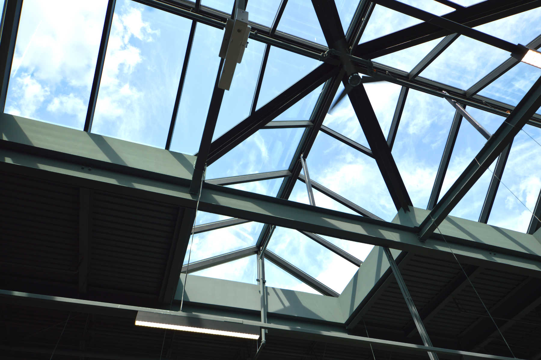Structures de support pour façades extérieures de l'édifice. Escalier d'accès à la mezzanine et garde-corps. Composantes protectrices des lanterneaux.